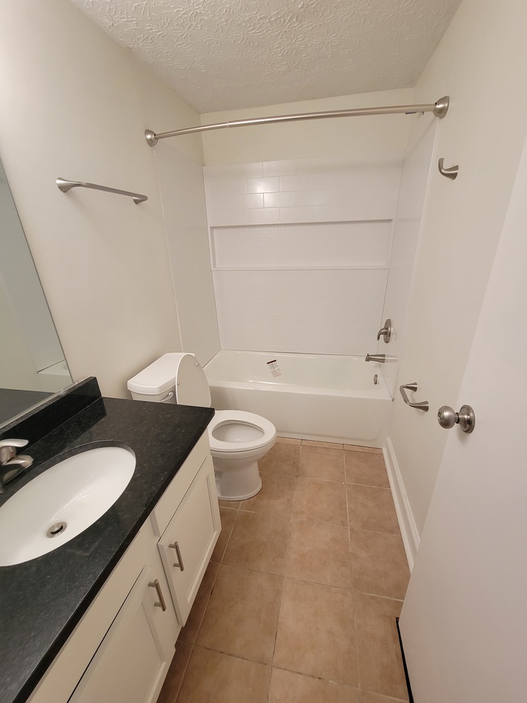 Renovated bathroom w/ new bathtub, surround and vanity with granite countertops